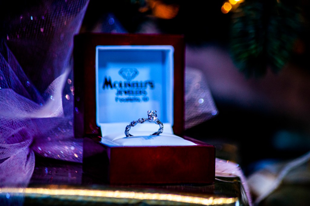 Molinelli’s Jewery let me come in and do a wedding ring shoot for my final assignment. I setup at the location and used props to build the scene. I used a 8×10 feet green screen to block the light of the windows near the Christmas tree. I had used 2 LED lights both double with 2 defuses and having a low aperture setting to highlight the gleams of the diamond. This was a hard shoot due to the heavy reflections from the stones. I was using a Macro lens from a distance to produce high detail on rings, but a tight shot without casting my own shadow by being to close. right. This did cause the logo to be out of focus on the image. The low My goal was to create the Christmas present wedding ring gift display. I hope you enjoy the image.